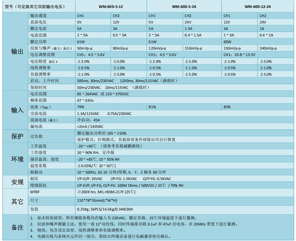 1.如未特别说明,所有规格参数均在输入为230VAC、额定负载、25℃环境温度下进行量测。