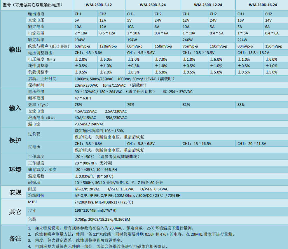 250D系列的开关电源也包括了好几款:WM-250D-5-12开关电源,WM-250D-5-24开关电源,WM-250D-12-24开关电源,WM-250D-16-24开关电源等,客户可以按需求选择。