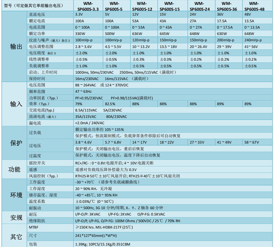 WM-SP600s系列开关电源特性: