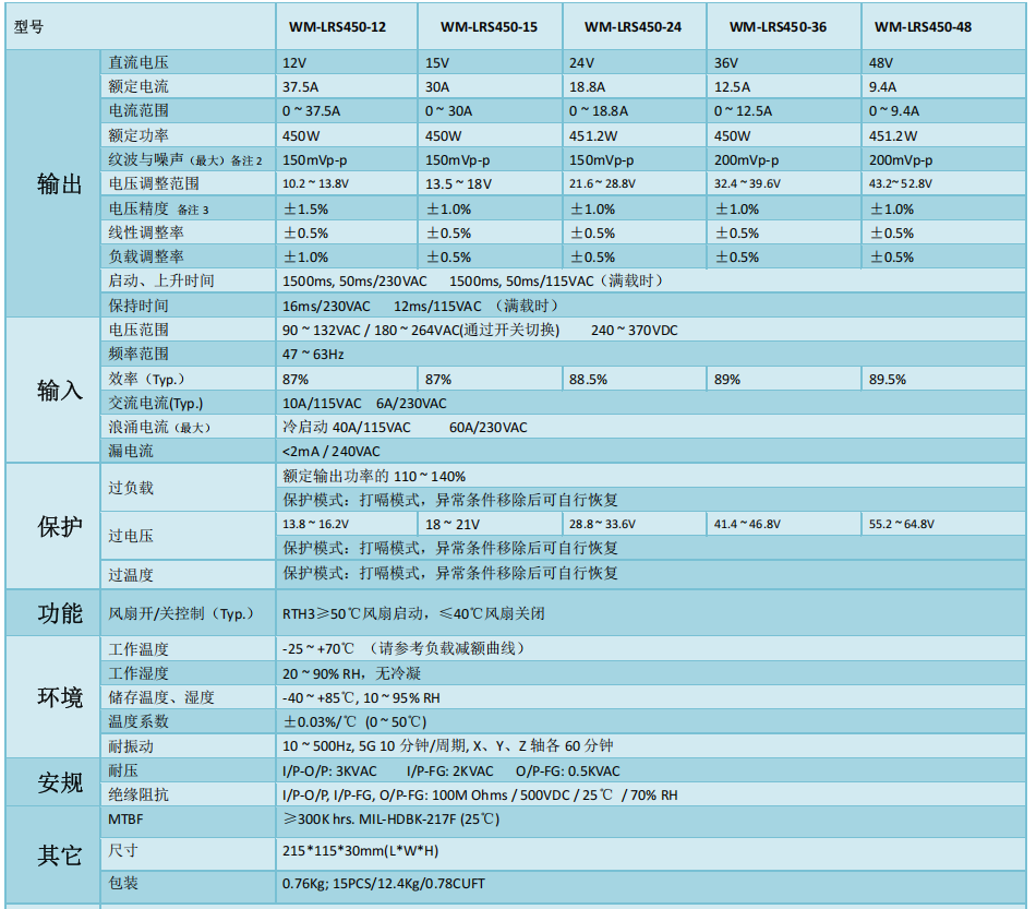 LRS450W系列开关电源包括的种类也有很多。其中包括:5V开关电源,12V开关电源,15V开关电源,24V开关电源,36V开关电源,48V开关电源
